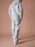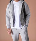 Le hoodie zippé présente une coupe ajustée mais confortable, avec poches avant pratiques et capuche enveloppante. Le pantalon assorti affiche une ligne verticale marquée pour une allure allongée et raffinée, complétée par une taille ajustable à cordon.