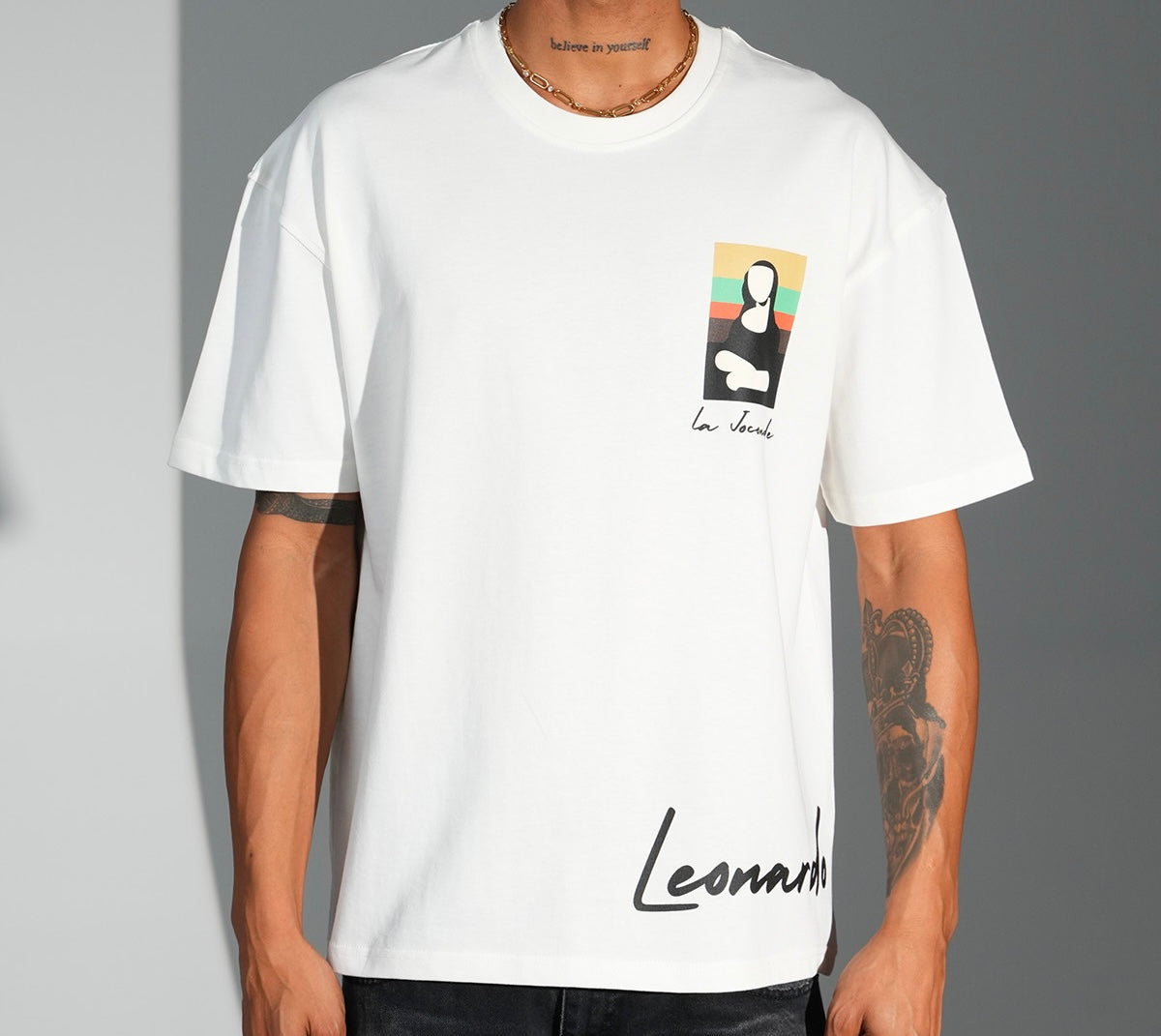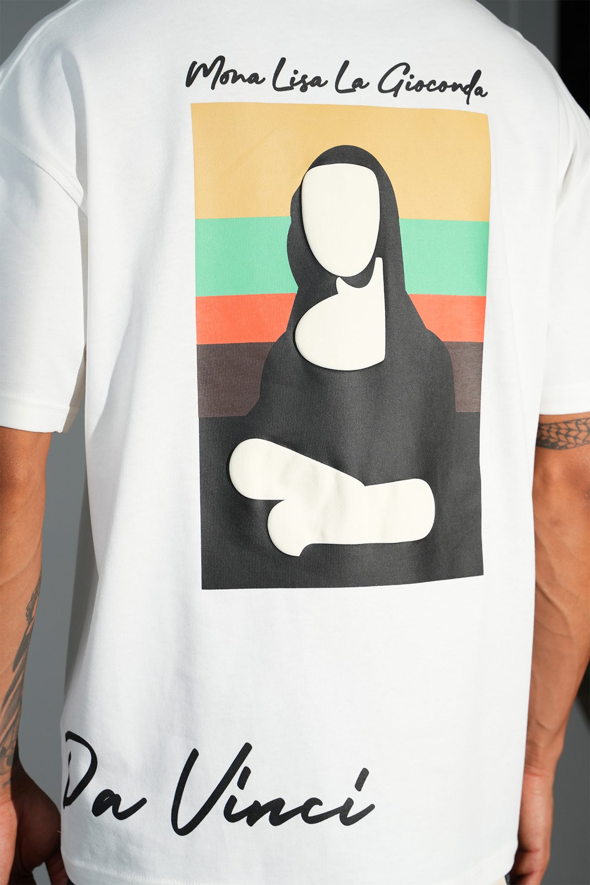 t-shirt oversize blanc, t-shirt la joconde, t-shirt streetwear homme femme, t-shirt art minimaliste, t-shirt léonard de vinci, mode urbaine arty, haut coton imprimé