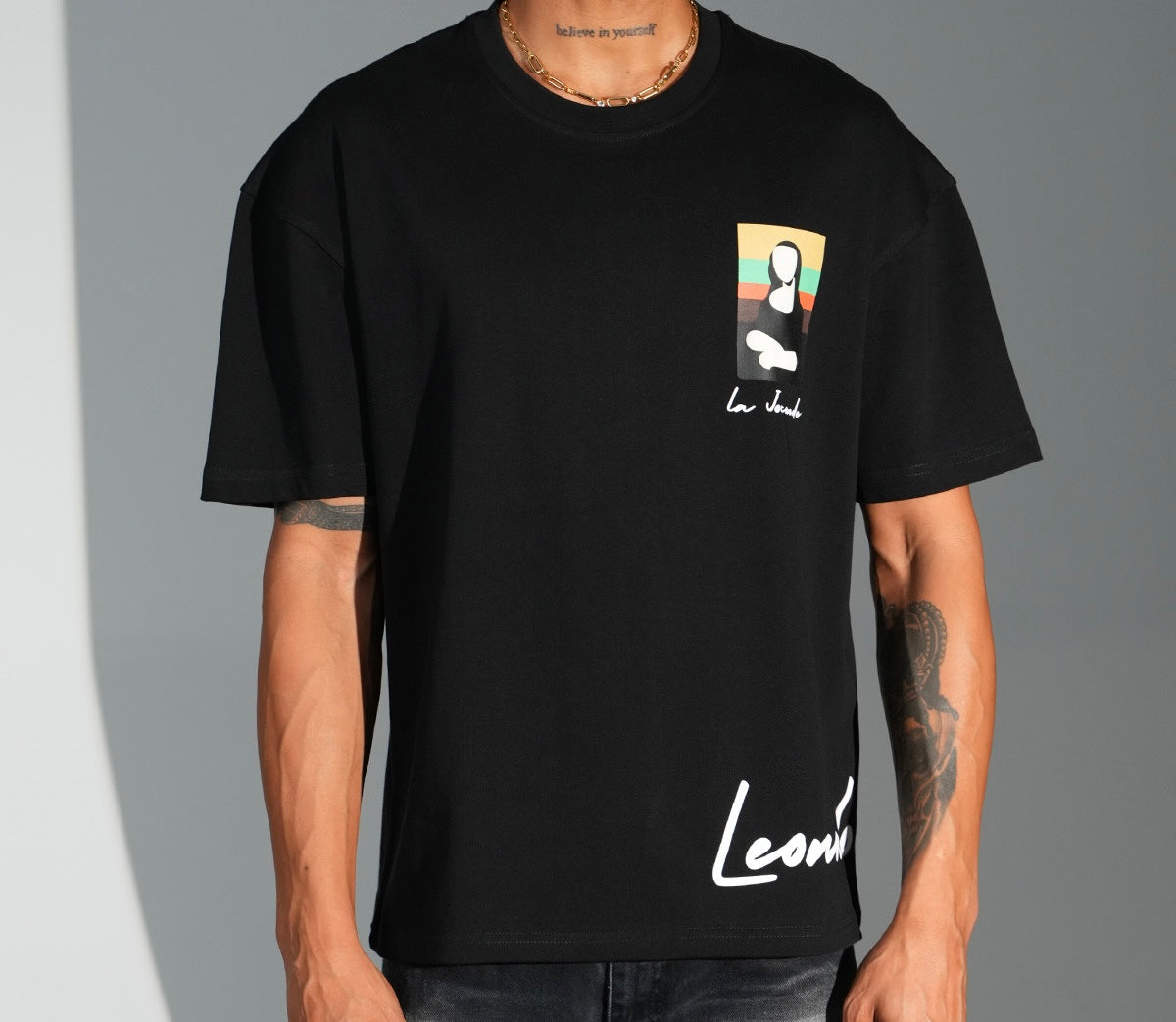 Réinventez un classique intemporel avec ce t-shirt oversize noir inspiré de la célèbre Mona Lisa de Léonard de Vinci. Avec son design minimaliste et moderne, cette pièce allie l’élégance de l’art à l’attitude streetwear.