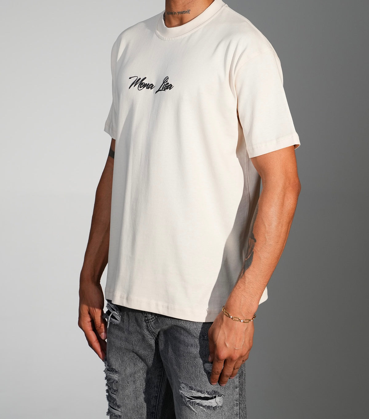 Apporte une touche artistique et moderne à ton look avec notre T-shirt “Mona Lisa Remix”. Un mélange audacieux entre art classique et esthétique urbaine : l’iconique Mona Lisa est réinterprétée avec un effet graphique déstructuré au dos, tandis que l’avant garde une sobriété classe avec l’inscription manuscrite “Mona Lisa”.