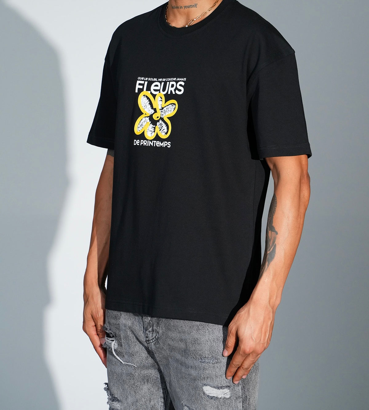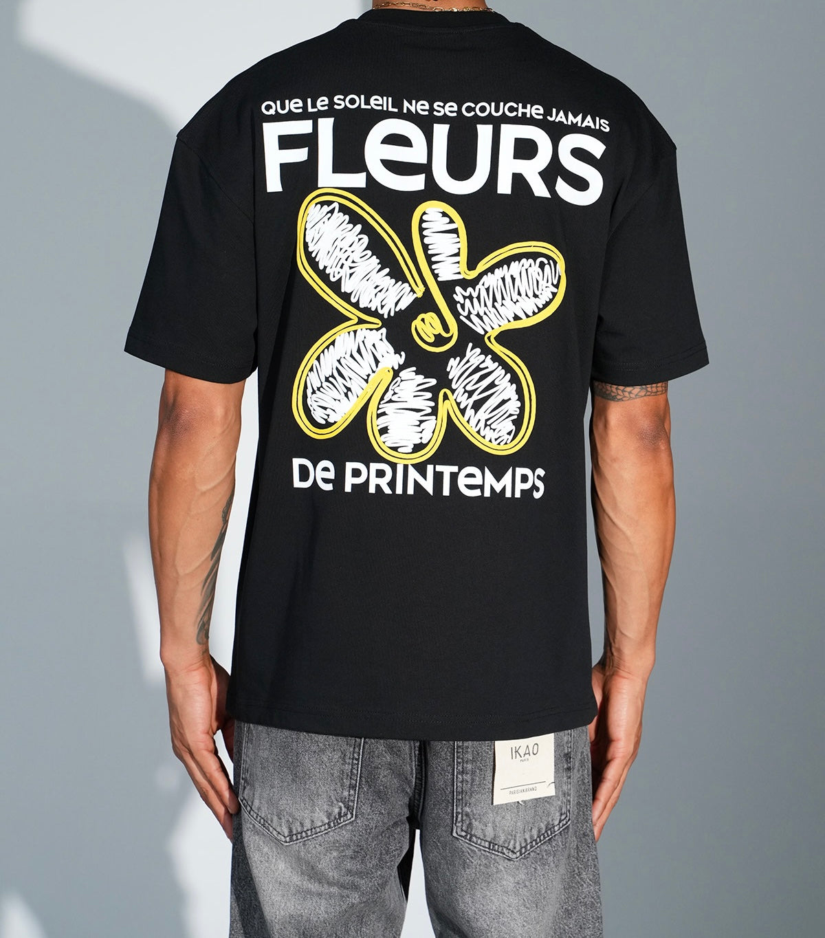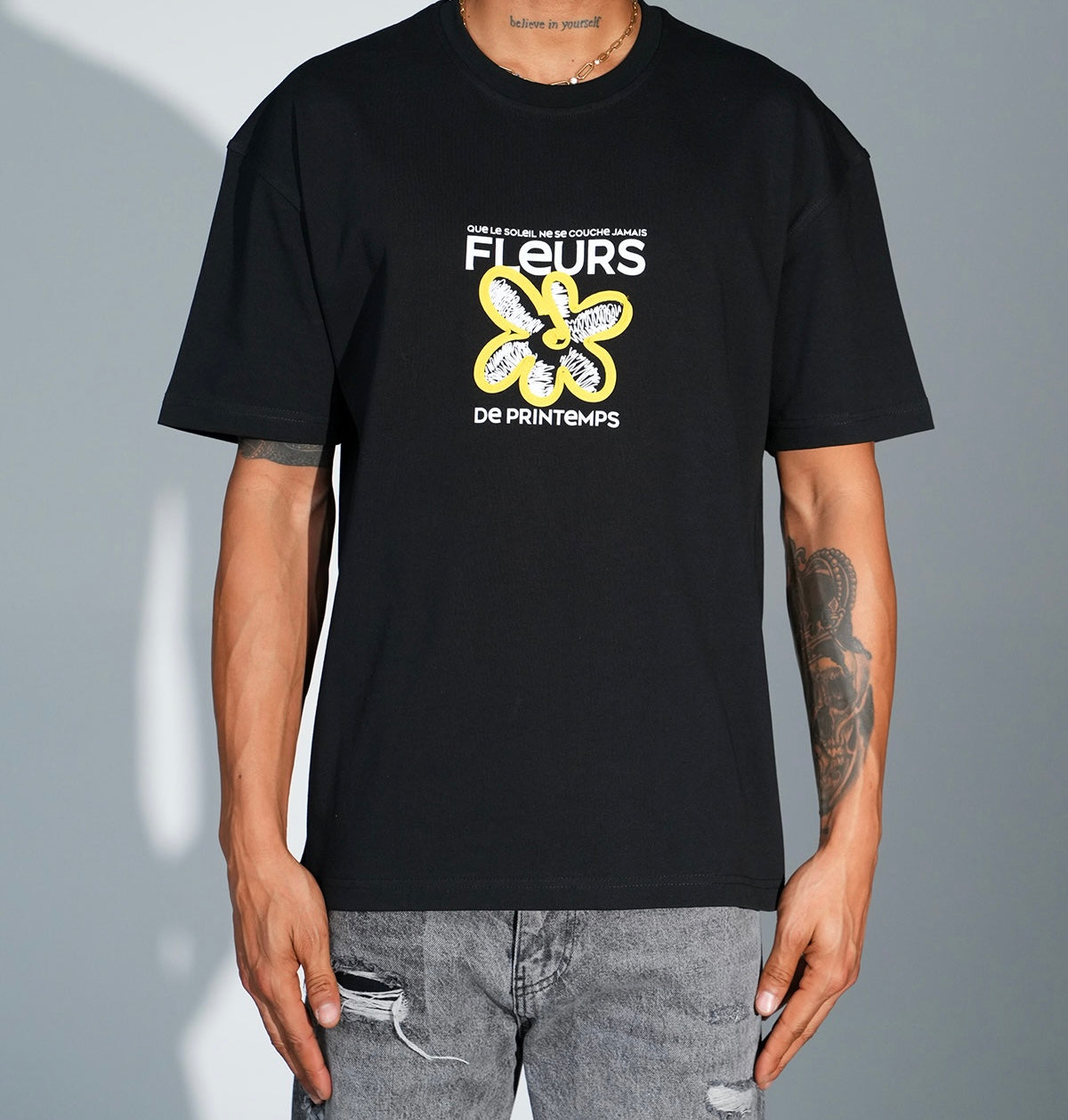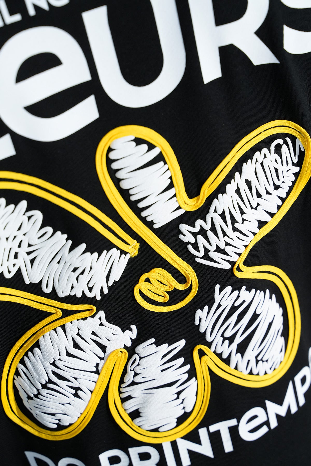 Ce t-shirt oversize noir célèbre la douceur et l’espoir avec un design graphique inspiré du printemps. Sa fleur crayonnée jaune et blanche attire le regard, tandis que le message fort en haut et en bas du visuel propage une énergie lumineuse.